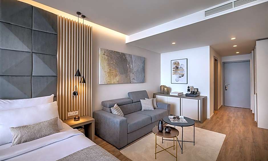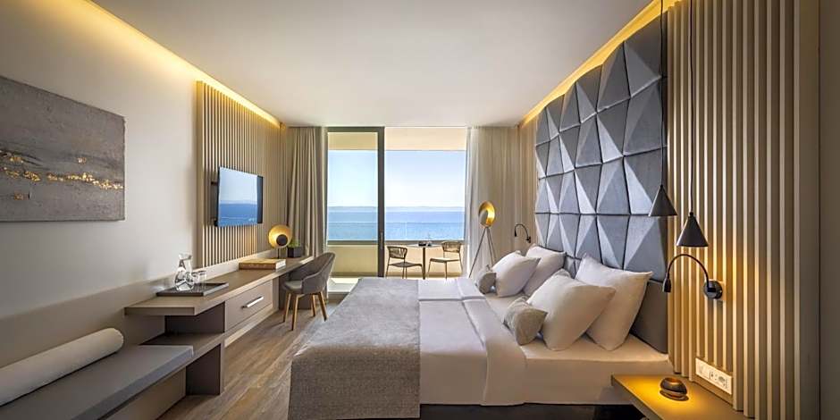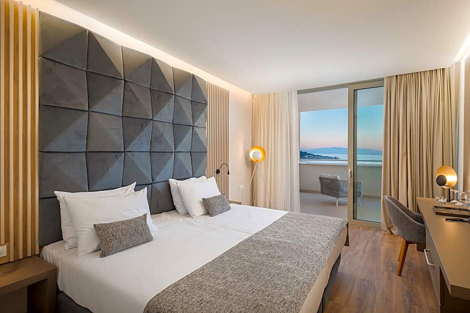 Luxury Room with Balcony and sea view is 366 square feet and includes a king-size bed 150-183 width plus a sofa bed plus balcony, satellite tv , hairdryer, and safe.